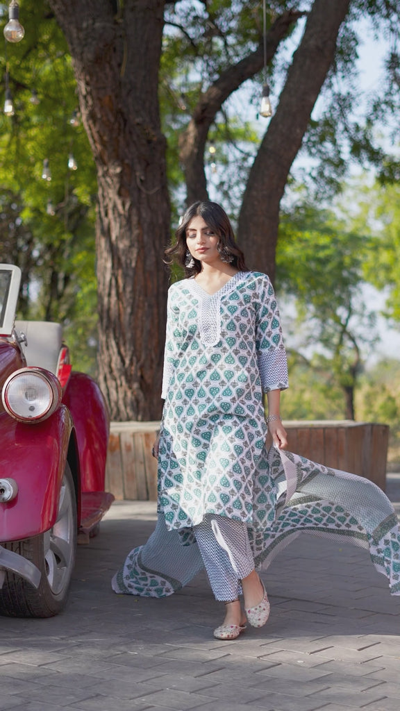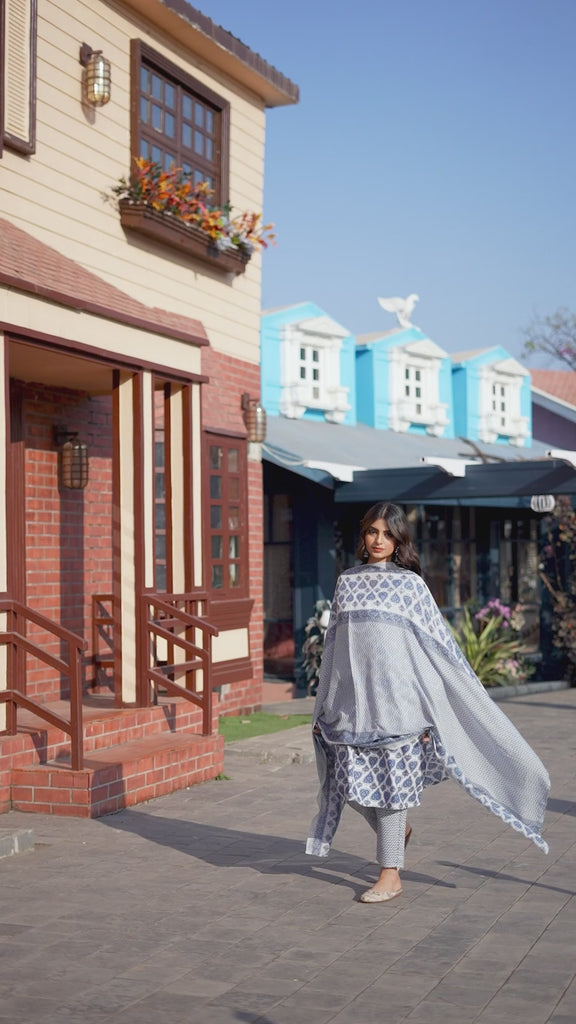 - Dupatta: A matching lightweight dupatta that often features a coordinated print, frequently with a striped or geometric border to complement the kurta's neck design.
